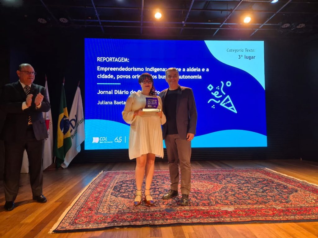 A jornalista Juliana Baeta conquistou o 3º lugar na categoria “texto” com a matéria Empreendedorismo indígena: entre a aldeia e a cidade, povos originários buscam autonomia.