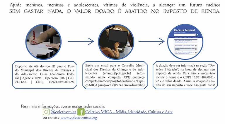 Mais detalhes sobre como fazer a destinação de parte do seu IR e colaborar com as ações do “Espaço Mica para Jovens” podem ser obtidos no e-mail [email protected] ou no @coletivomica nas redes sociais.