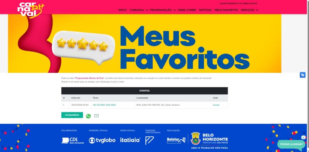 A ferramenta já está disponível com a programação oficial do pré-Carnaval e do Carnaval de BH. Para usar, basta acessar a página dos blocos de rua no portal e clicar no ícone de coração, localizado no canto superior direito, para favoritar os desfiles de interesse. Depois disso, o usuário pode acessar a aba “Meus Favoritos”, onde a programação personalizada é gerada automaticamente e pode ser compartilhada com amigos e familiares via WhatsApp.