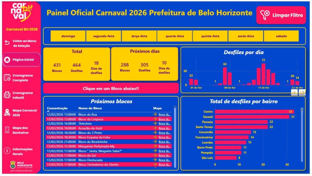 Desenvolvido no formato Power BI, o painel apresenta informações organizadas em uma tela única, com identidade visual alinhada à marca do Carnaval e da Prefeitura de Belo Horizonte (PBH). A iniciativa é resultado de uma parceria entre a Belotur e a Prodabel, com o objetivo de ampliar o acesso às informações e apoiar tanto os foliões quanto a gestão do evento.