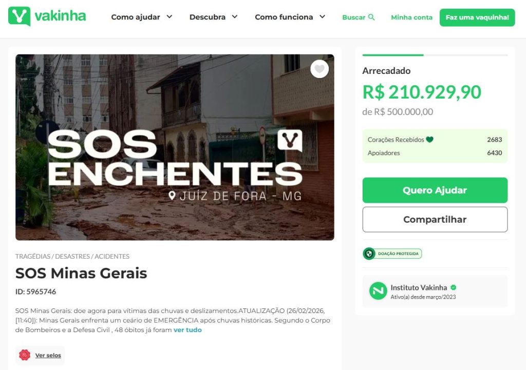 A campanha “SOS Juiz de Fora” (clique aqui) é organizada pelo Instituto Vakinha e recebe contribuições financeiras de qualquer valor que, segundo a plataforma, serão usadas para compra de itens essenciais como água potável, alimentos e produtos de higiene; para apoio a famílias que perderam móveis e eletrodomésticos; para auxílio na reconstrução de moradias atingidas; e para suporte emergencial para desabrigados. Além do link, é possível contribuir via Pix pela chave: [email protected].