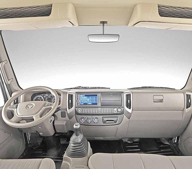 Interior – O design das novas cabines foi inspirado em estudos da Foton sobre os caminhões urbanos do futuro, valorizando conceitos como aerodinâmica, leveza, fluidez e elegância.
