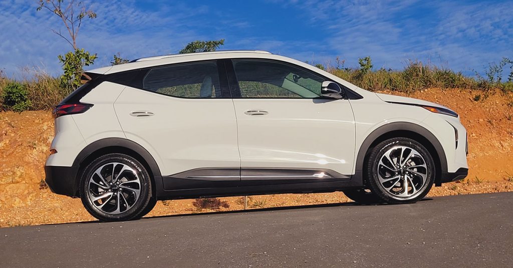 Lateralmente, o Bolt EUV tem os dois volumes melhor definidos do que o EV, a frente mais destacada da cabine, teto menos arqueado e vidro traseiro mais inclinado, perfil que em nada lembra um monovolume e, sim, o faz parecer um SUV coupé.