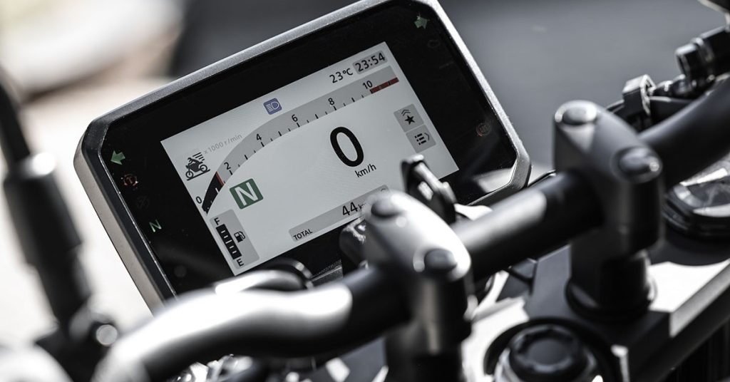 O painel TFT colorido de cinco polegadas, assim como o comando de punho esquerdo retroiluminado, são detalhes que se somam aos indicadores de direção autodesativáveis e ao sistema ESS (Emergency Stop System).