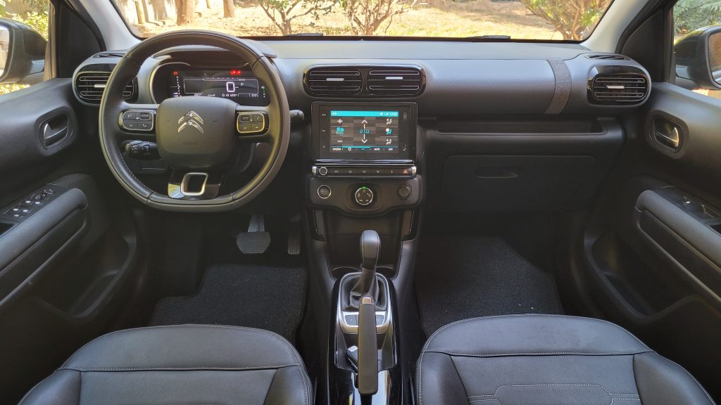 Sua ergonomia geral é acertada. Todos os controles são alcançados sem grandes movimentos dos braços. Os botões dos vidros traseiros, que ficam na porta do motorista, estão mais recuados que o ideal, o único detalhe negativo de posicionamento que observamos. Outro porém é que a Citroën concentrou muitos comandos na tela do multimídia, suprimindo diversos botões físicos que fazem falta no dia a dia.