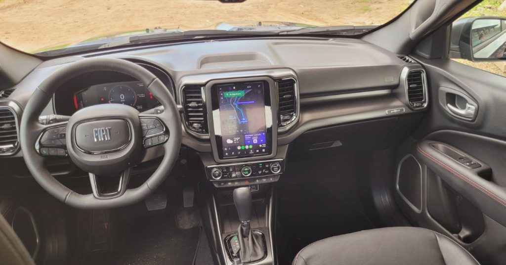 O espaço interno da Toro é muito bom na frente e bom atrás. Motorista e carona têm e área de sobra para pernas, ombro e cabeças.