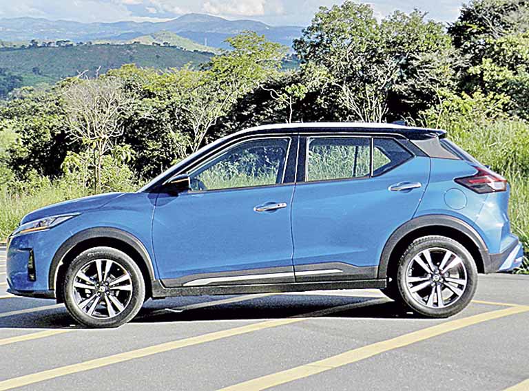 Nas laterais, tudo igual. Por este ângulo, somente as novas rodas identificam o Kicks 2022. Na cabine, não houve mudanças no design. Materiais de revestimento com novas cores e padronagens são as únicas novidades internas.