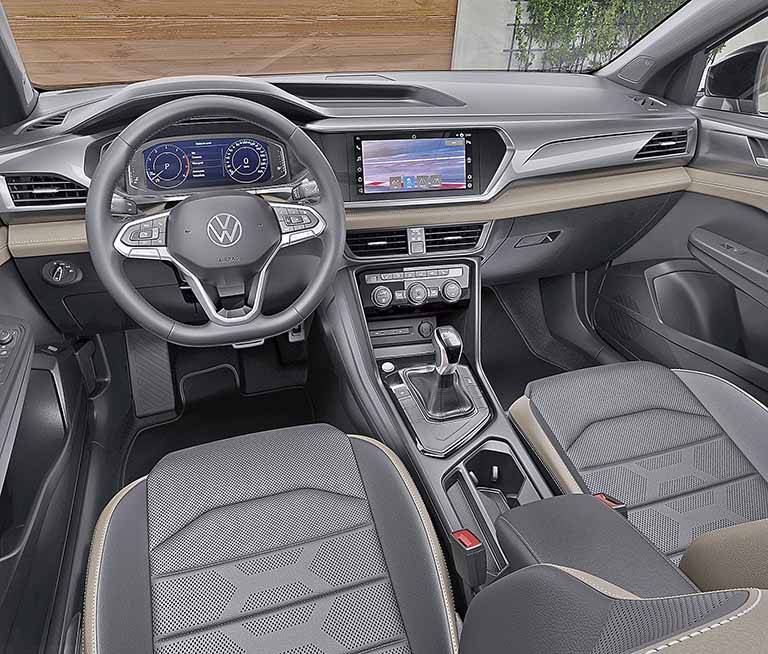 No interior, de acordo com a Volkswagen, a equipe de design da marca se inspirou em 3 conceitos-chave: premium, único e sofisticado. A disposição horizontal do painel transmite sensação de espaço e coloca à vista do motorista a “ilha digital”, composta pelo Active Info Display (quadro de instrumentos digital) com tela de 10,25 polegadas e o sistema multimídia VW Play, que apresenta tela de 10,1 polegadas sensível ao toque.