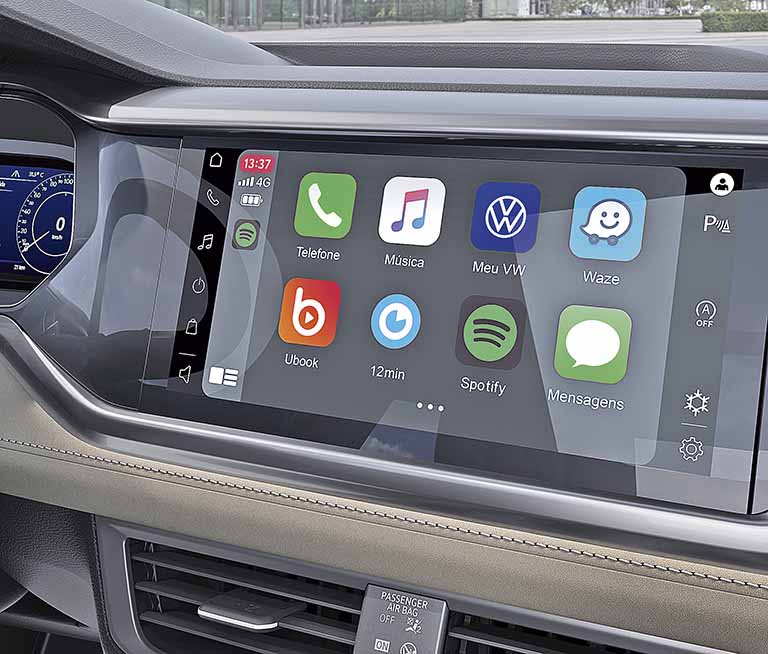 A central multimídia, desenvolvida no Brasil, oferece a possibilidade de baixar aplicativos na VW Play Apps, além de configurar o perfil, vincular o celular por meio de Wireless App Connect e ainda programar o serviço de manutenção do carro.